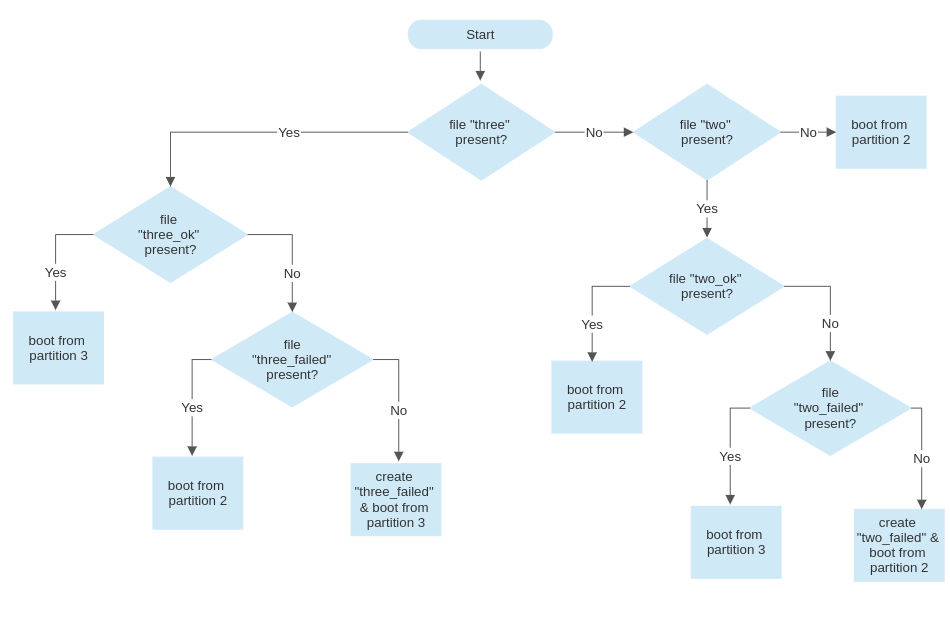 This section explains the workings of u-boot for choosing the right partition to boot from. Understanding this section is required to be able to troubleshoot any issues you may face. At a high level, we configure u-boot to look for a specific file in the boot partition to know which partition to boot form. For example, if file “two” is present, uboot boots from partition 2, and if file “three” is present, uboot boots from partition 3. The following flowchart explains the Root Switch logic in detail.