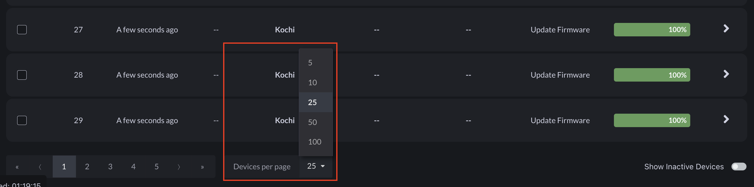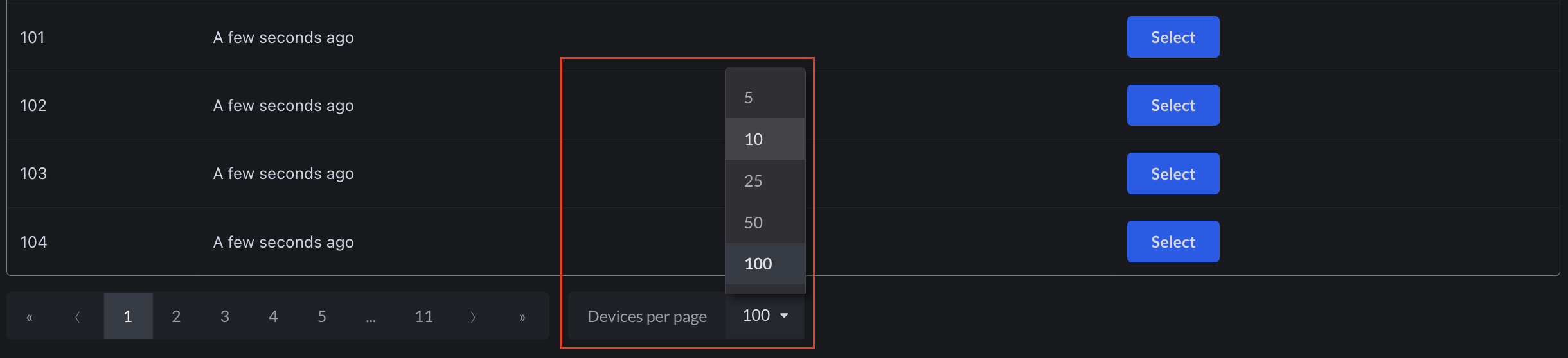 Empowering our users to choose the desired number of devices to display on a single page. Easily manage your devices by setting the optimal viewing quantity per page. This option is available in device management and in the device selection in the device dashboard.