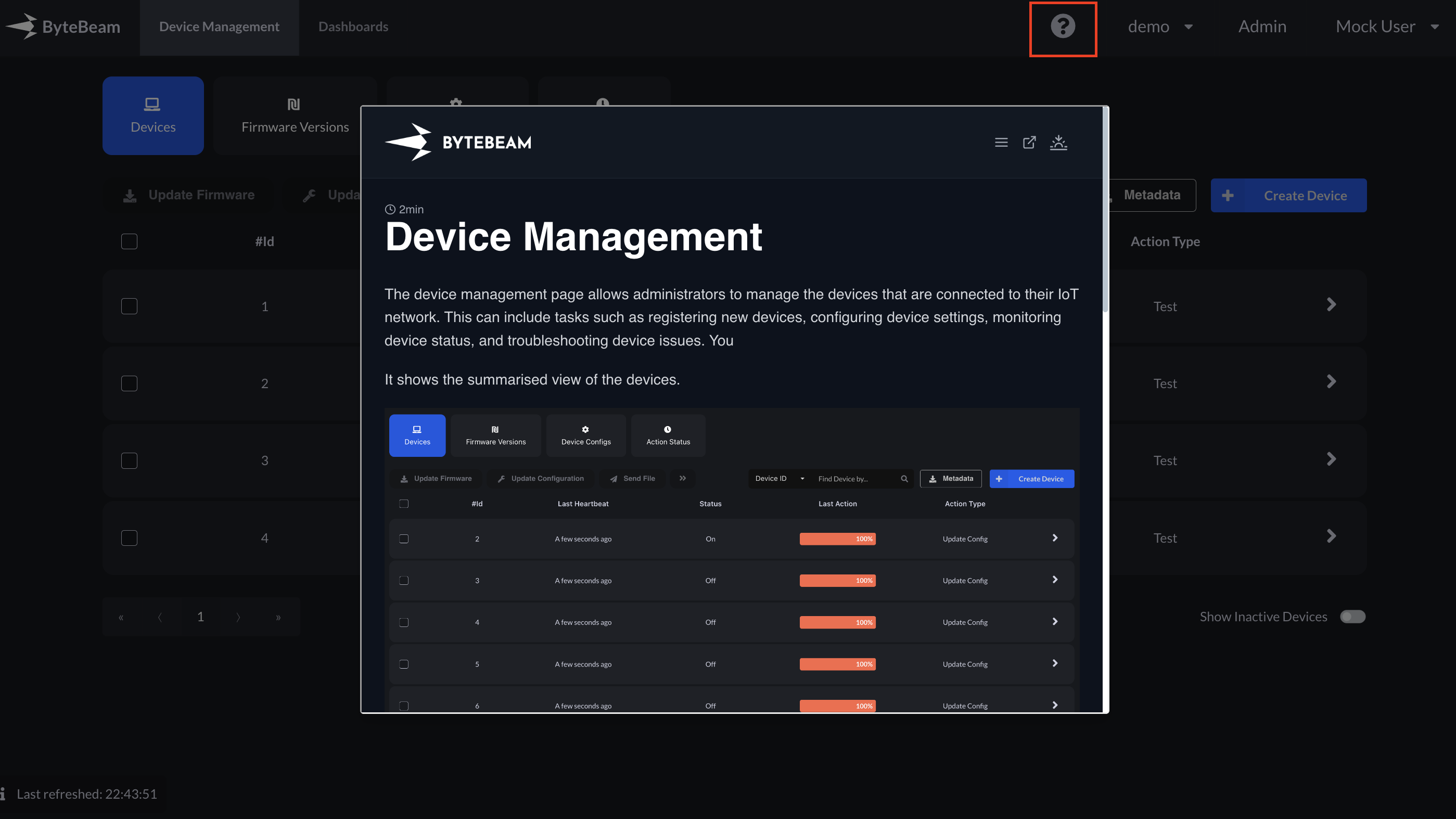 Now you can access the Bytebeam documentation within the cloud. You can click on help icon to get relevant documentation