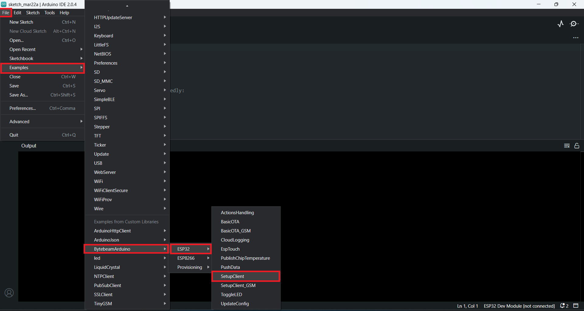 Look at the SetupClient example sketch for reference. See File > Examples > BytebeamArduino > ESP32 > SetupClient within the Arduino IDE.
