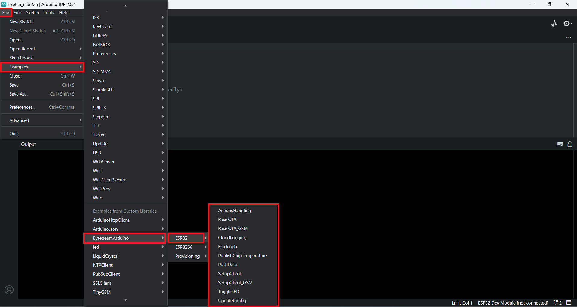 3. Open SPIFFS Provisioning example sketch as per your choice of file system. See File > Examples > BytebeamArduino > Provisioning > SPIFFSProvisioning within the Arduino IDE.